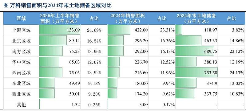 一般情况,开发商土储是三年销售的规模。这张图上看,万科2024年西南区域的土储是销售的三倍以上,而上海区域的土储已经不到0.3倍了。而从今年上半年的销售情况看,上海区域已经没货了,北京还算健康,其他的南方,西南,东北这三个地区的去化周期已经来到五年,三年多四年这样。这种严重的库存结构失衡,大大延长了万科的“触底时间”。$万科A(SZ000002)$