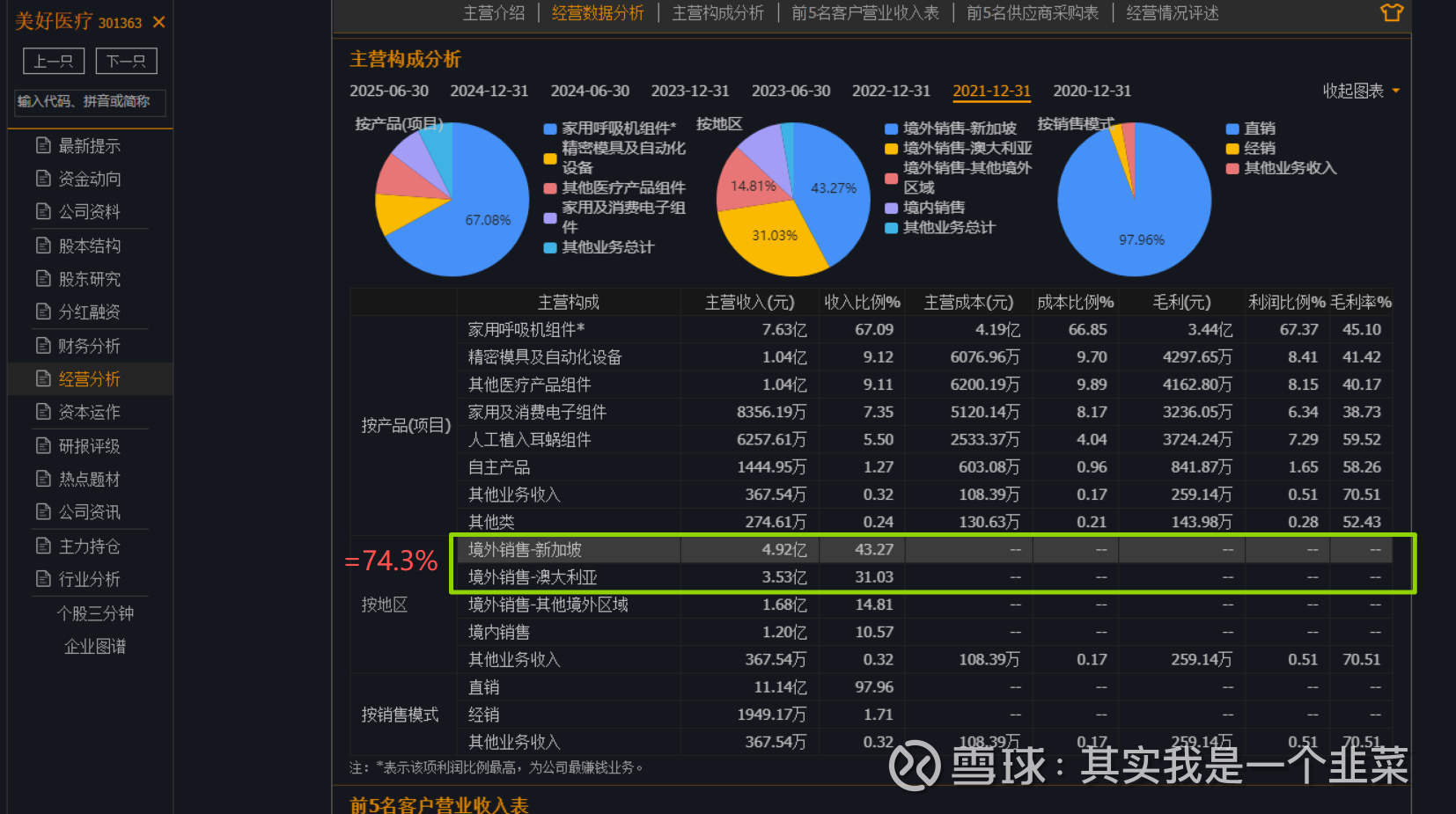 美好医疗在2021年还披露外销的详细情况:新加坡最大有4.92亿,占比43.27%;澳大利亚3.53亿,占比31.03%,这两个国家合计8.45亿,占比74.3%;