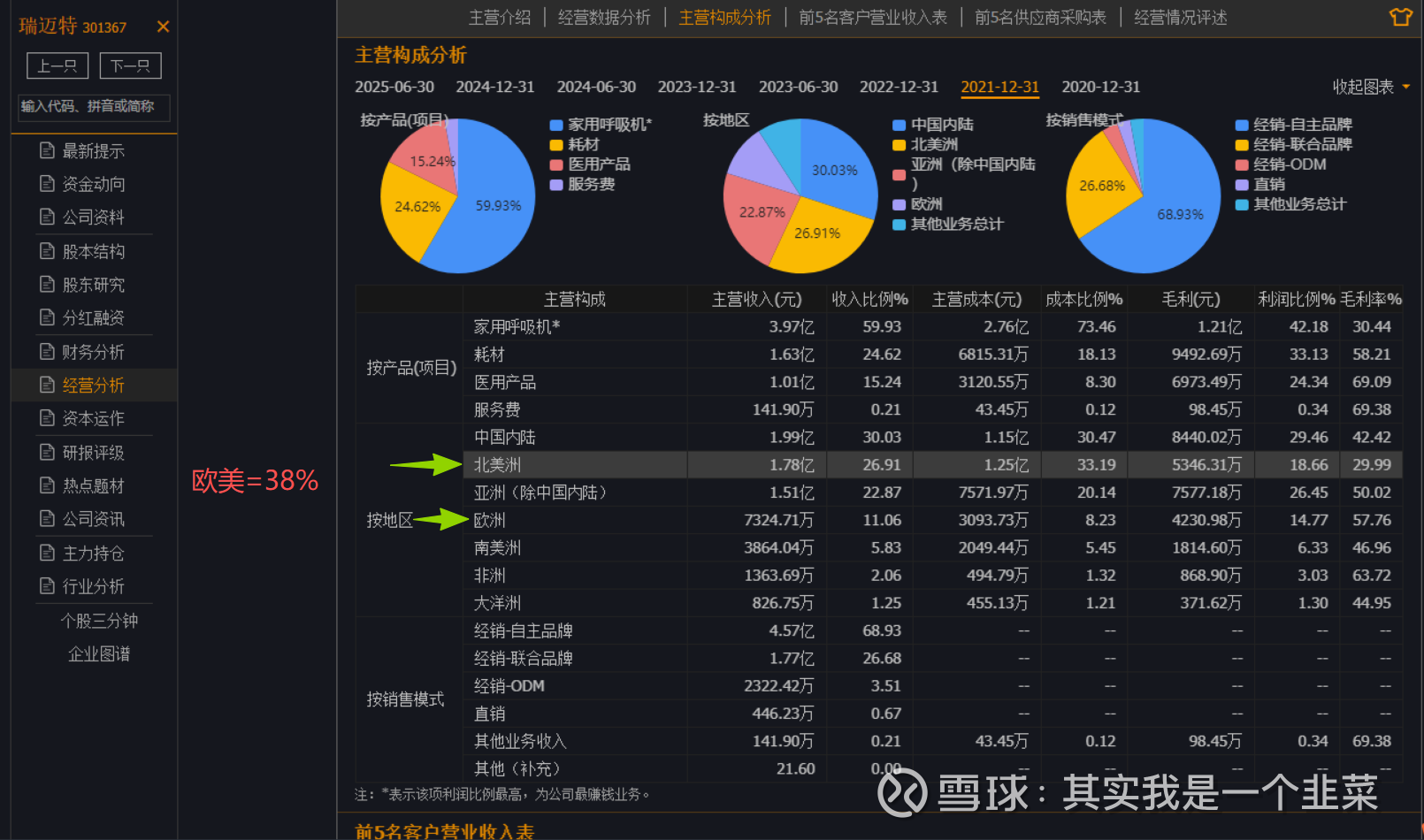 瑞迈特呢,也是2021年还披露,后来就不披露了:北美1.78亿,占比26.91%;亚洲(除内陆)1.51亿,占比22.87%;欧洲0.73亿,占比11.06%;如果把欧美放在一起计算,是2.51亿,占比38%,比例最大;