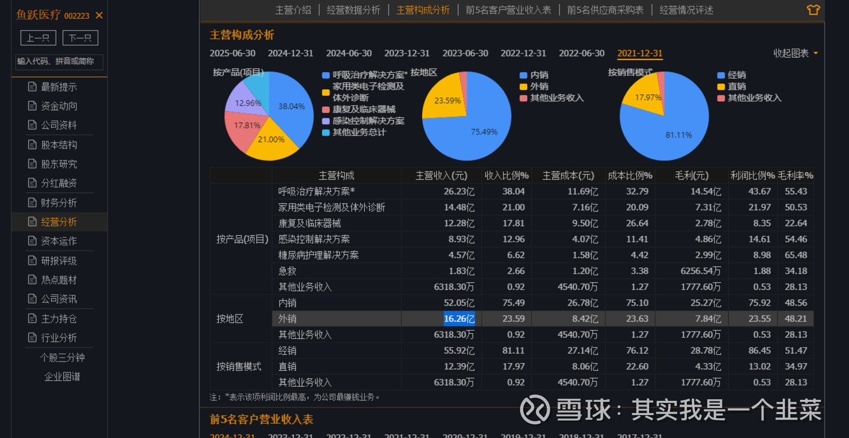 鱼跃医疗的话,也找2021年吧,时间维度一致:外销16.26亿,占比23.59%;