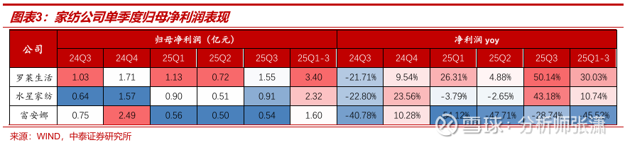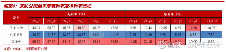 收入端:25年前三季度罗莱生活/水星家纺营收同比增长5.75%/10.91%至33.85/29.76亿元,25年来单季度增幅逐季提升;富安娜收入同降13.8%至16.3亿元,主动调整推进去库。利润端:25年前三季度罗莱生活/水星家纺归母净利润同比增长30.03%/10.74%至3.4/2.32亿元,Q3单季度表现超预期。富安娜归母净利润同降45.52%至1.6亿元,降幅收窄但仍承压。