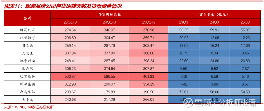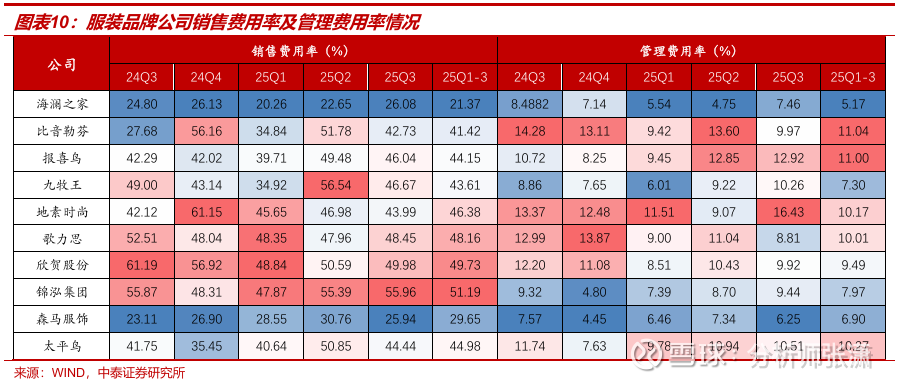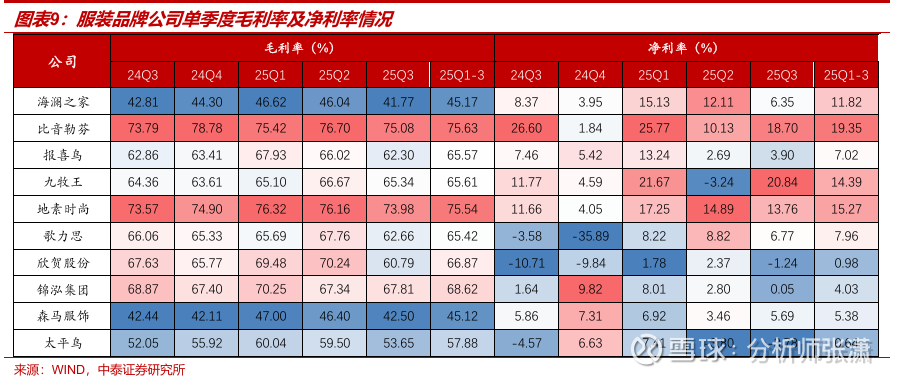 1)男装:费用率提升拖累单季利润。海澜之家毛利率/净利率同比-1.04/-2.02pct,预计线下渠道仍有恢复空间。比音勒芬毛利率同比提升1.29pct至75.08%,展现高端品牌韧性,但净利率同比下降7.90pct,期间费用投放加大、利润率承压;报喜鸟毛利率同比微降0.56pct,净利率同比下降3.56pct。2)女装:推进精细化运营与费用优化。存量竞争格局下女装库存折扣压力较大,仅地素时尚在渠道优化下毛利率逆势提升0.4pct。品牌审慎投流、费用率有所降低,歌力思与欣贺的Q3销售费用率分别下降4.1/11.2pct,净利率同比改善明显。3)大众休闲:森马盈利能力回升,销售费用率提升主因直营扩张及线上投流。森马服饰单Q净利率5.69%(Q2为3.46%),盈利能力环比回升带动前三季度净利率达到5.38%。 相比之下,太平鸟仍在渠道与费用结构的调整期,其前三季度销售费用率高达44.98%,净利率仅为0.64%。