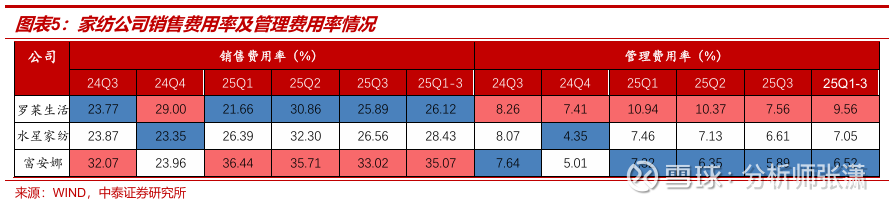 营销费用投放效果逐步显现,管理费用控制良好。25Q3罗莱生活/水星家纺/富安娜销售费用率呈现提升趋势,同增2.1/2.7/0.9pct至25.9%/26.6%/33%。主要是公司为配合大单品战略持续加强营销力度,Q3电商销售增速进一步提速效果卓越。预计未来随着销售规模增长,有利于费用压力减轻、利润弹性释放。25Q1-Q3水星家纺/富安娜管理费用率有所改善,同比小幅下降0.5/1.2pct至7.1%/6.5%,罗莱前三季度管理费用增加主要受诉讼纠纷一次性影响,整体来看家纺公司控费情况良好。