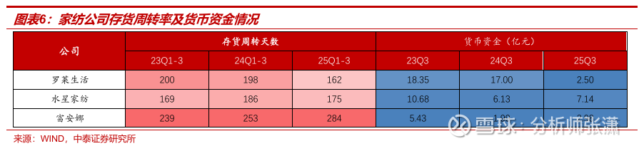 存货周转保持稳健,账上现金充足。25Q3罗莱生活/水星家纺存货周转天数同比减少36/11天至162/175天,库存情况优化明显,富安娜存货周转天数同比增加32天至285天,期待逐步改善。25Q3罗莱货币资金下降,主要是购买较多理财产品,投资活动大幅净流出,当期经营性现金流5.43亿,保持健康水平。