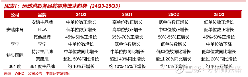 具体运动流水表现:25Q3安踏主品牌流水同比低单位数增长,FILA品牌同比低单位数增长,其他品牌流水同比45-50%增长;李宁25Q3流水承压,全渠道流水中单位数下滑、电商渠道高单位数增长;特步主品牌流水实现低单增长,索康尼流水同比增长20%+;361度整体延续二季度的趋势,主品牌线下流水同比增长10%,电商流水同比增长20%,体现产品质价比优势。
