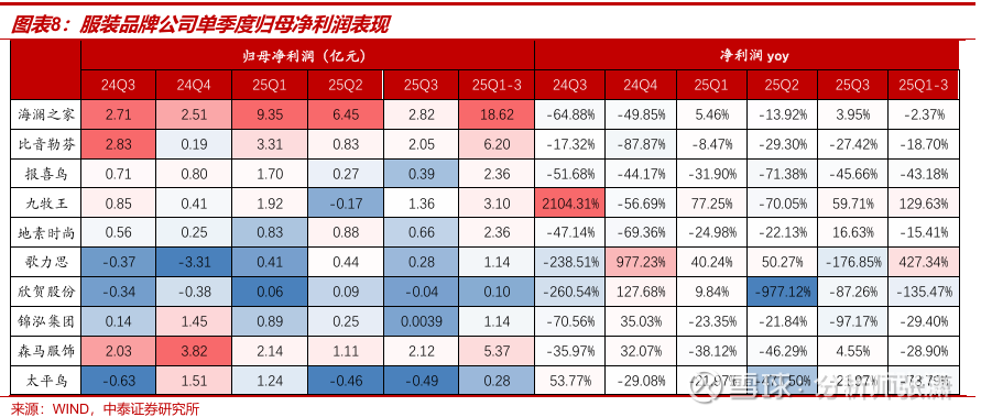 1)男装:整体平稳,利润端有所分化。25Q3海澜之家收入与利润均小幅增长、主业稳健托底,新业态与海外业务快速扩张;比音勒芬收入微增但利润承压;报喜鸟收入正增长但利润下滑较多;九牧王收入下滑。2)女装:普遍边际回暖。25Q3地素时尚单季利润恢复双位数增长;歌力思整体收入下滑但预计国内可比口径增长、利润扭亏;欣贺收入高增10%,但利润端压力较大;锦泓收入微跌,但预计IP授权以及云锦业务保持高速增长。3)大众休闲:森马Q3收入与利润双增、费用控制改善,Q4开局良好;太平鸟Q3单季转亏,渠道与费用结构调整期。