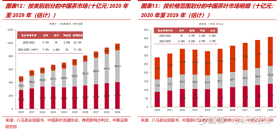 过去几年茶市场规模主要靠现制茶饮引领增长,中国茶叶市场整体规模由2020年的2,889亿元增长至2024年的3,258亿元,复合年增长率约为3.0%,预计2029年增至4,079亿元,2024至2029年复合年增长率为约4.6%。此外,中国高端茶叶市场相较中国整体茶叶市场呈现出更为快速的发展势头,中国高端茶叶市场规模由2020年的890亿元增长至2024年1,031亿元,复合年增长率约为3.7%,预计将达到2029年的约人民币1,353亿元,2024年至2029年复合年增长率约为5.6%。