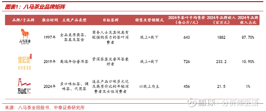 八马茶业是国内知名的茶叶供应商,产品全面覆盖中国六大品类茶叶及茶具等产品。截至2024年底,公司在国内茶叶连锁专卖店数量最多,同时在高端茶叶市场、乌龙茶和红茶市场的销售收入亦排名第一。公司主要有三大品牌:品牌为八马茶业覆盖全品类高端原叶茶占比87.7%;除此之外,副牌信记号聚焦高端年份普洱茶,占比10.90%;新成立的万山红则追求口味多元化,目标用户转向年轻消费者及女性消费者,目前占比约为1%。