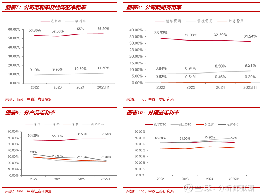 2025H1年公司整体毛利率55.2%,净利率达到11.3%。主要产品茶叶的毛利率在规模效益下稳步提升,25H1线上渠道毛利率提升至60.1%。费用控制下净利率也呈现逐步提升的趋势。