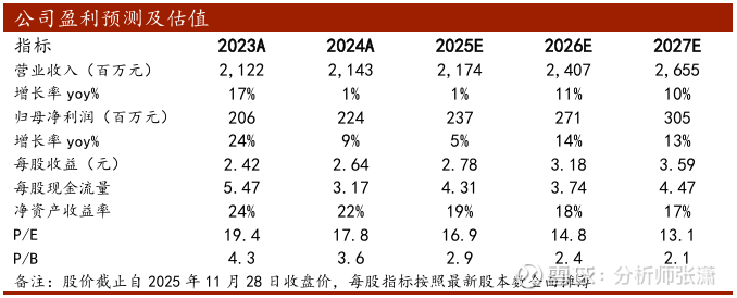 净利润与盈利能力:在收入增长与费用管控的共同作用下,公司盈利能力稳步提升。我们预测,2025-2027年归母净利润将分别达到2.37/2.71/3.05亿元,同比增速分别为5.5%/14.4%/12.9%。