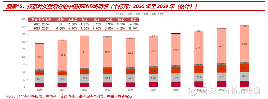 其中绿茶占比最高,乌龙茶、黑茶等增速较快。预计2024年至2029年乌龙茶叶市场增长的复合年增长率预计为6.1%,主要由于传统乌龙茶叶的持续消费,以及乌龙茶叶广泛用于无糖茶饮料和现制茶饮推动其需求不断增加。