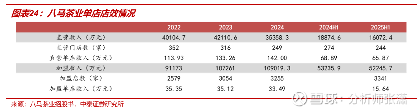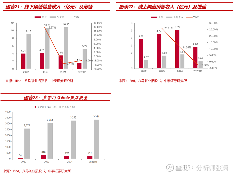 线下:近年来公司持续开店,2022 年底至 2025H1,公司门店总数从 2,931 家增至 3,585 家,其中加盟门店数量由 2,579 家增至 3,341 家,占比高达93.2%,推行"零加盟费+托管式管理"模式。而直营门店则从 352 家减少至 244家。直营门店的减少是由于品牌战略性关闭部分店铺,转而打造具有更大的门店空间、更先进的设计以及更丰富的茶文化及品茶体验的旗舰店,又有效地展示品牌形象。