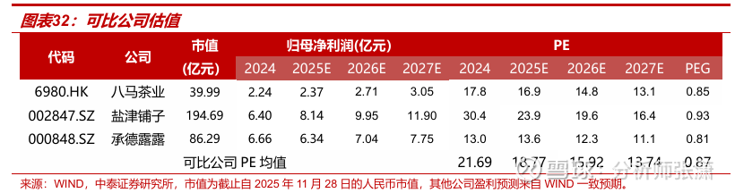 可比公司估值分析:我们选取承德露露(礼品消费属性)与盐津铺子(连锁零售模式)作为八马茶业的可比公司:一方面,八马与承德露露同样具备礼品消费场景和品牌心智,其高端茶叶需求具备相似韧性;另一方面,其连锁经营的商业模式与盐津铺子通过掌控供应链、深耕渠道以实现高质量增长路径高度相似。估值方面,八马当前PE低于高成长性的盐津铺子,作为高端茶叶品牌龙头,八马在高度分散的茶业市场具备一定的整合潜力,以及其“礼品+成瘾性消费品”的双重属性价值,给予成长性一定估值溢价,估值水平略高于承德露露较为合理。