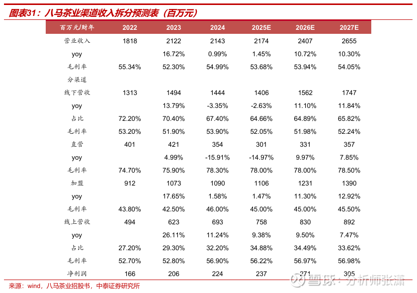 营业收入预测:我们预计公司营业收入将保持稳健增长,展望2025-2027年,在加盟渠道持续扩张与线上业务稳健发展的驱动下,预计营业收入将分别达到21.74/24.07/26.55亿元,同比增速分别为1.5%/10.7%/10.3%。增长动力主要来自于线下渠道门店数量及店效的同步提升以及八马品牌力持续增强带动线上渠道收入的稳步提升。