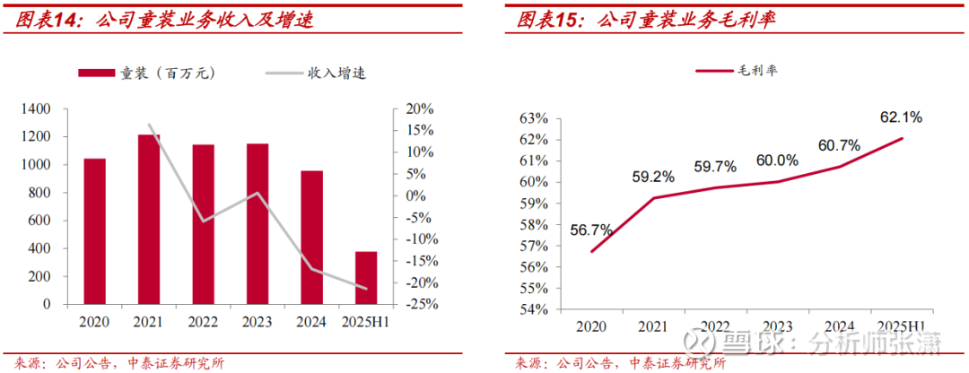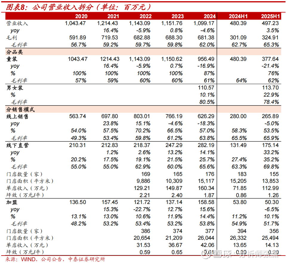 品牌调整尾声,童装业务有望迎来高质量发展。2024年在行业价格竞争加剧的环境下,公司坚持中高端品牌定位,坚定品牌力是品牌发展的第一动力。从设计风格、版型、面料、工艺及品牌形象方面进行全面升级,同时在价格上采取低折扣策略,避免参加线上超深折扣活动。聚焦中高端的打法帮助公司童装品牌进行消费群体的有效筛选,但在短期内对收入造成一定扰动。2024年及2025H1公司童装收入同比分别下降16.9%、21.4%,但毛利率呈现持续提升趋势,截至2025H1童装毛利率达到62.1%。后续来看,随着品牌升级后新旧消费客群切换基本完成,童装业务有望进入高质量发展阶段。