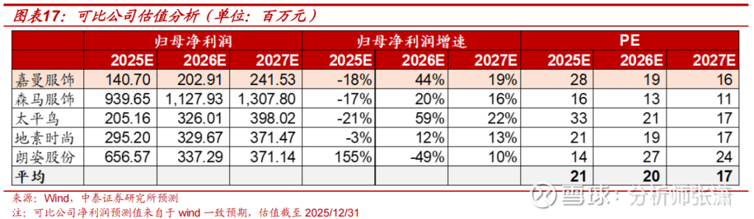 可比公司估值分析:我们选取森马服饰、太平鸟、地素时尚、朗姿股份作为可比公司,四家可比公司2025-2027年一致预期对应PE均值为21、20、17,嘉曼服饰2025-2027年预测PE分别为28、19、16,在可比公司中属于中枢偏下水平。