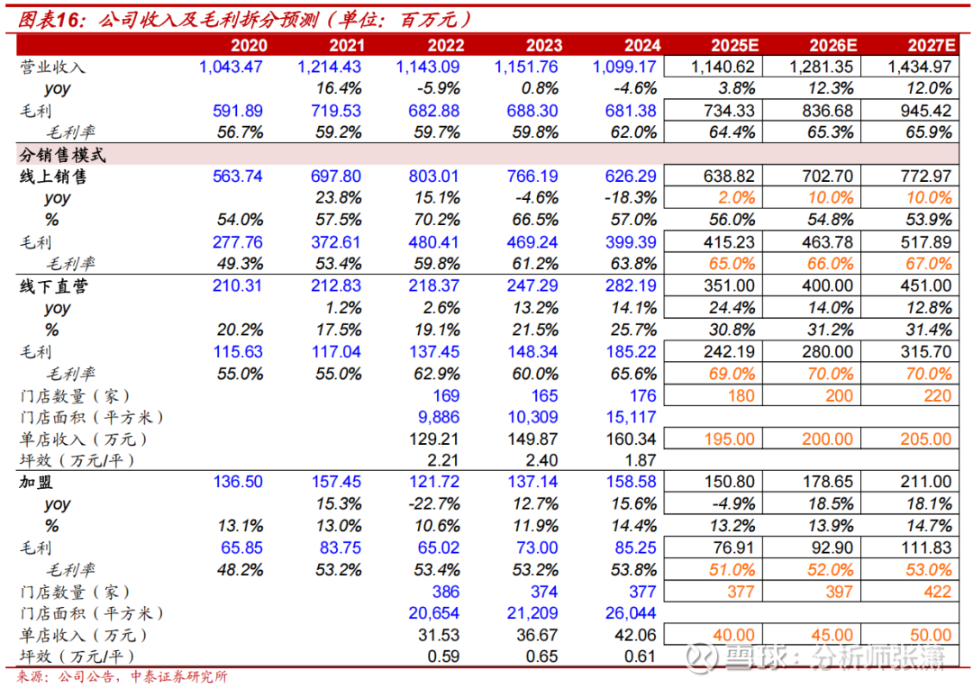 毛利率:产品结构优化升级下,预计直营(电商+线下)毛利率将有所提升,加盟渠道毛利率由于在未提价的情况下短期略有收缩。预计2025-2027年线上渠道毛利率分别为65%、66%、67%,线下直营毛利率分别为69%、70%、70%,加盟渠道毛利率分别为51%、52%、53%,综合毛利率分别为64.4%、65.3%、65.9%。