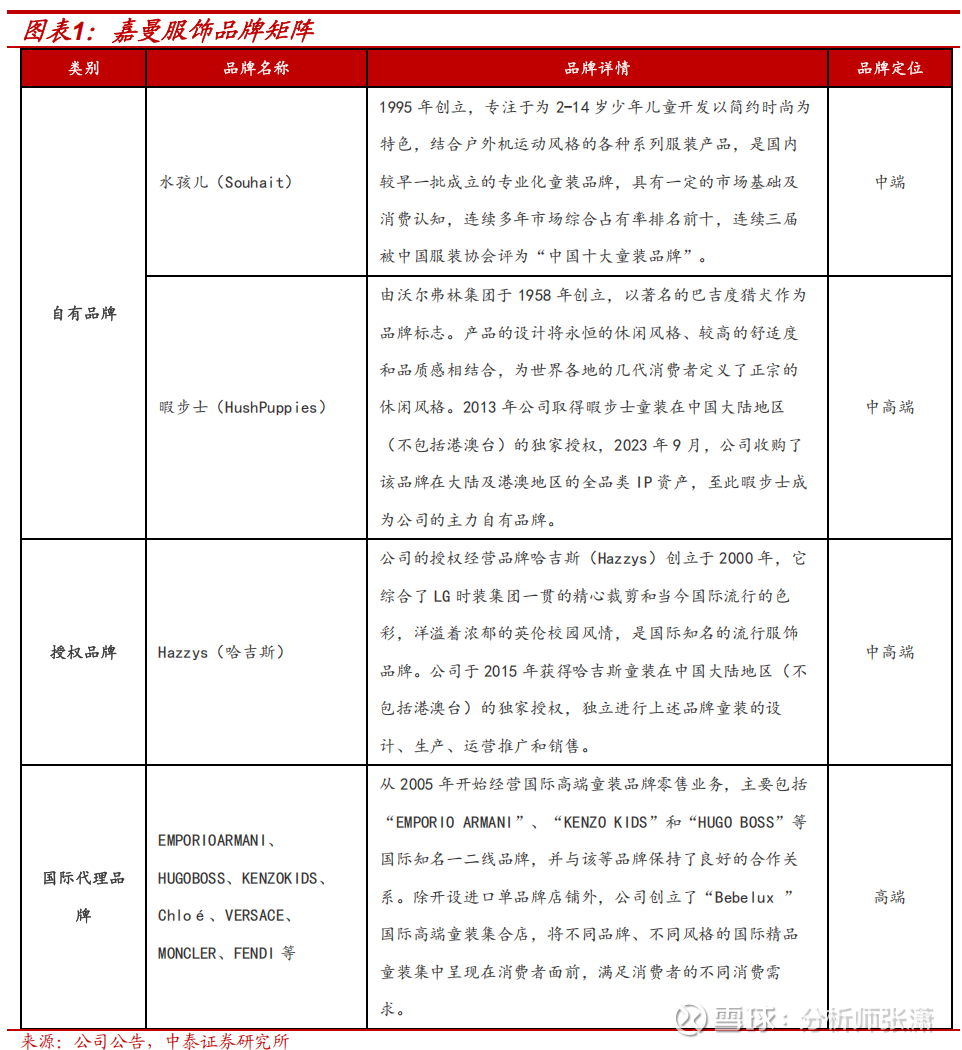 公司概要:多元化品牌矩阵的品牌服装运营企业。公司是一家中高端品牌服装运营企业,前期主要聚焦于童装品类,后通过收购暇步士拓展至成人装和成人鞋品类。公司采取多品牌差异化运营策略,目前拥有自有品牌暇步士和水孩儿,授权经营品牌哈吉斯,十余个国际零售代理品牌:EMPORIO ARMANI、HUGO BOSS等。