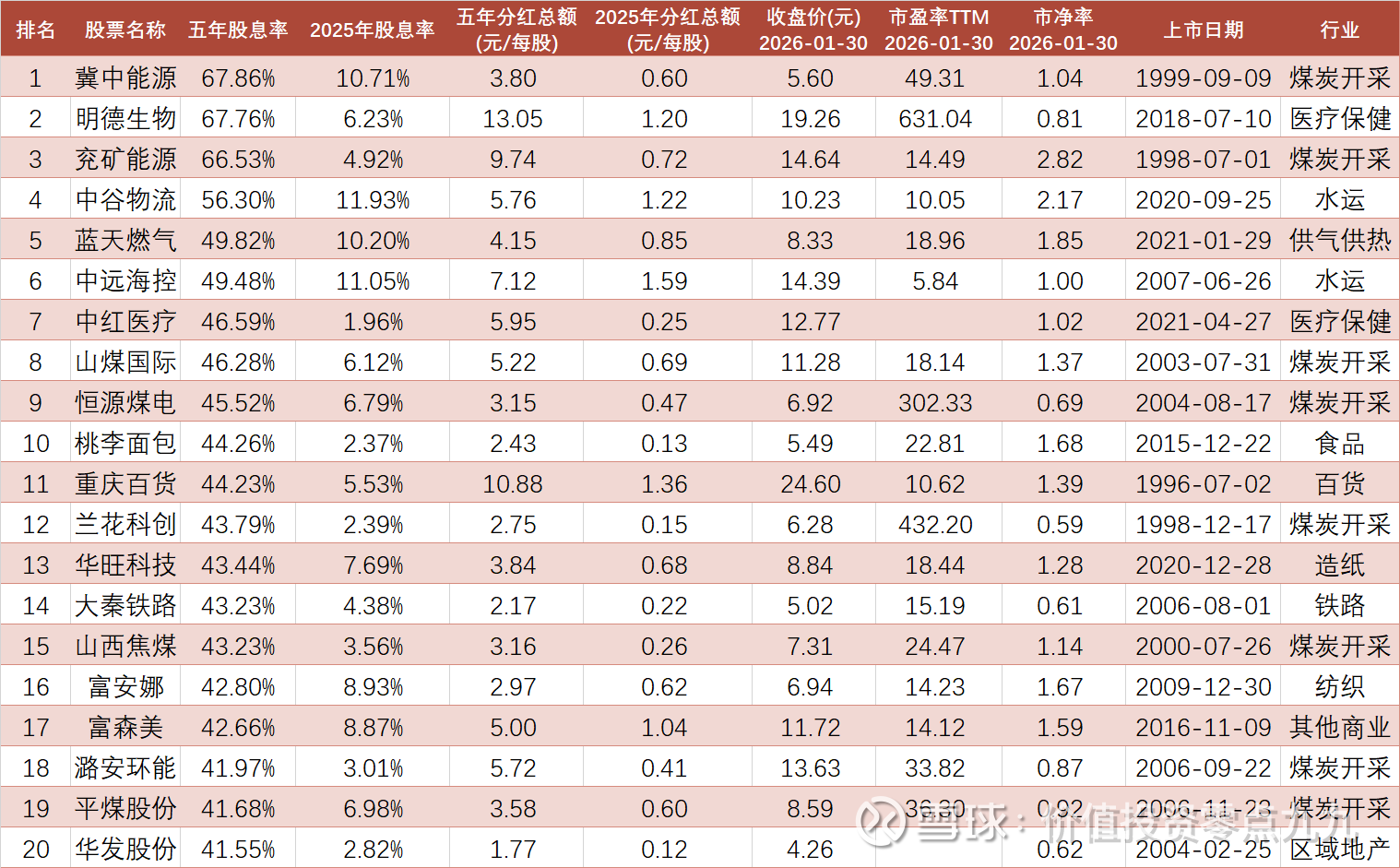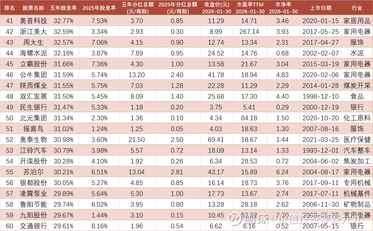 五年股息率=每股五年分红总额/2026年1月30日收盘价