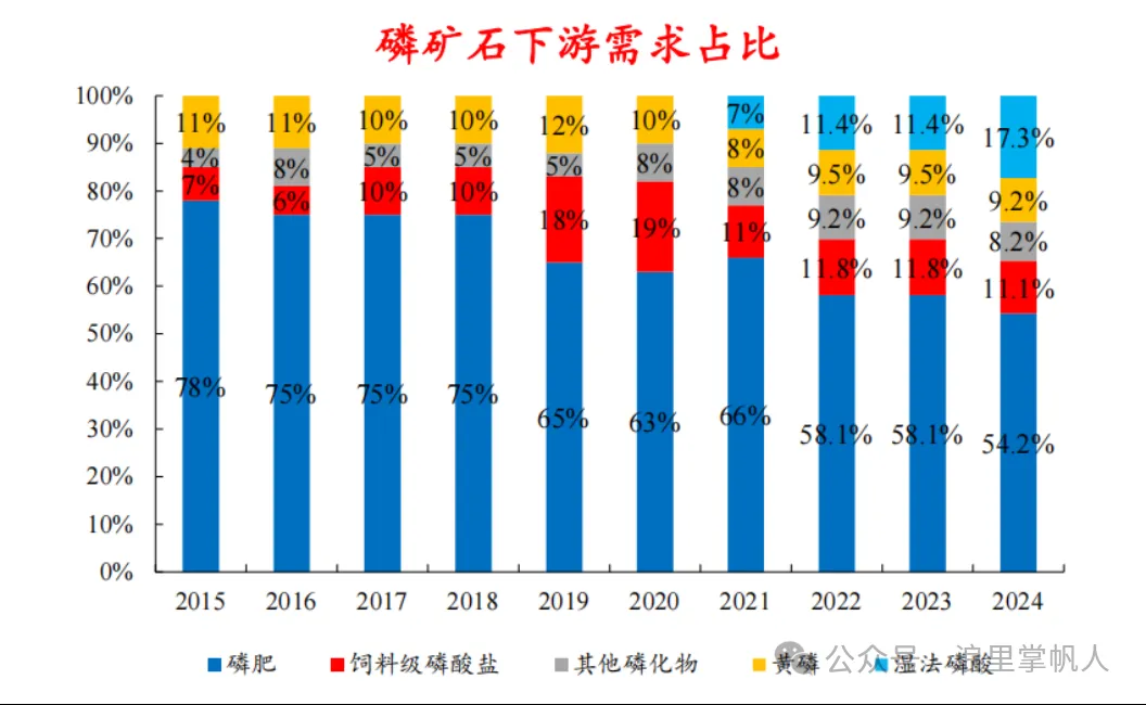 磷矿石下游需求主要是磷肥(磷酸一铵和磷酸二铵),需求占比在60%以上;其次是饲料级磷酸盐和黄磷(饲料级磷酸盐主要用所饲料添加剂,补充钙和磷;黄磷的下游需求主要是食品添加剂和农药草甘膦等),这两个方向需求相对稳定;增量和变动最大的是湿法磷酸,即磷酸铁锂电池带动磷矿边际需求大幅增加,像磷肥和钛白粉相关的公司都在加大该链条的布局(生产钛白粉会副产磷酸铁锂的原料硫酸亚铁,该项业务都在盈亏边沿,不好赚钱)。