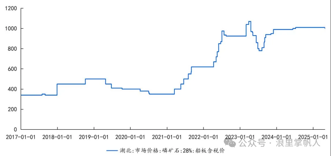 在需求端,磷肥的基本盘需求稳定,新能源汽车的发展推动磷酸铁锂电池装机大增,为磷矿带来增量需求,使得磷矿价格这几年维持在高位。根据国家统计局数据,2025年上半年国内磷矿石总产量约为5,970万吨,同比增加16.73%;磷矿石价格相对稳定,28%品位磷矿石船板价格维持在960元/吨左右。