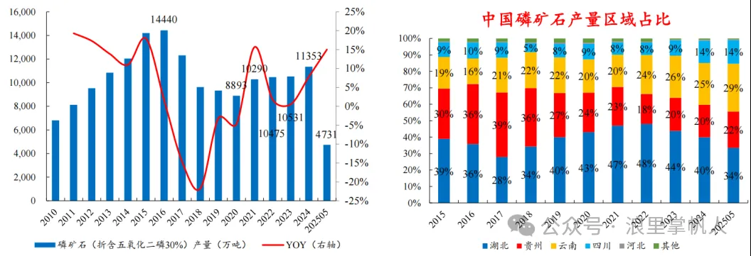 2024年我国磷矿石产量达到1.13亿吨(储量仅占全球5%,产量占40%左右),同比增长7.8%;湖北(40%)、云南(25%)、贵州(20%)、四川(14%)四省合计贡献近99%的产量。