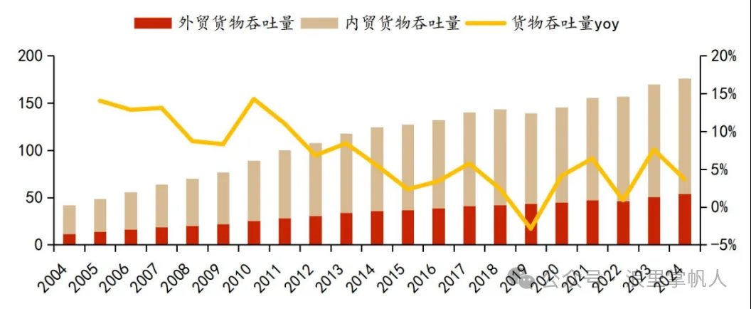 根据交通运输部统计的数据,2024年全国港口累计完成货物吞吐量176亿吨,比上年增长3.7%,其中外贸货物吞吐量54亿吨,增长6.9%;集装箱吞吐量3.32亿标箱,增长7.0%(今年上半年货物吞吐量同比增长4%,其中外贸同比增长1.8%;集装箱吞吐量同比增长6.9%),从吞吐量上看继续稳居世界第一,这也是港口盈利的基石。