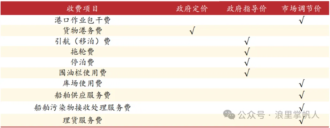 根据2019年版《港口收费计费办法》,港口收费包括实行政府定价、政府指导价和市场调节价的经营服务性收费,具体详见下图所示。
