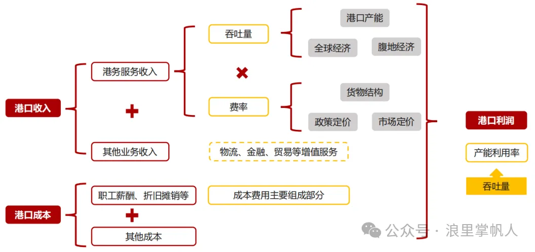吞吐量主要取决于全球及腹地经济发展(腹地就是港口所在省份或通过铁路或水路间接相连的省份,像山西的煤炭通过大秦铁路可运输至环渤海湾的港口,长三角港口区的背后可以延升至沿长江经济带各省份);费率包含政府定价和市场定价部分,并受不同种类货物处理毛利率水平制约;成本端大头是折旧摊销、员工薪酬、物料等,相对来说比较稳定。