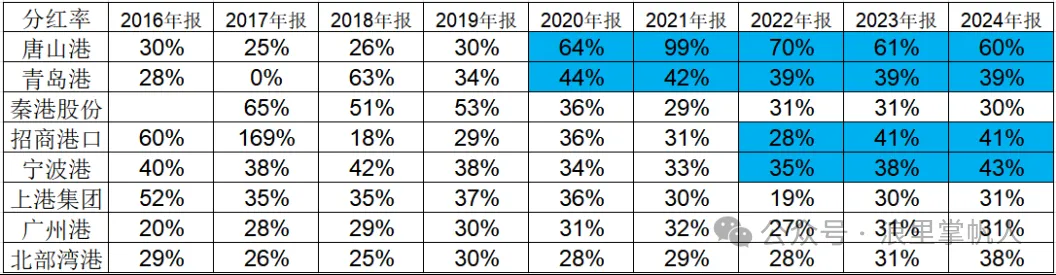 分红率:行业主流分红率还是在30%附近,但是像唐山港从2020年开始分红率已经提到了60%,青岛港提高到了40%,是港口中的分红担当;招商港口和宁波港也在近两年把分红率提高到40%这个门槛线。
