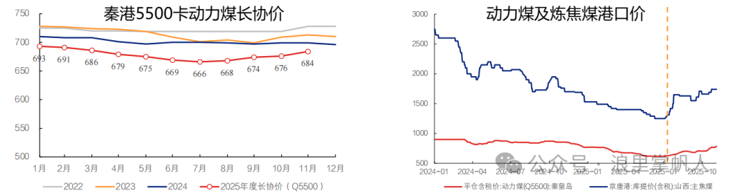 煤炭价格:2025年前三季度秦港动力煤(Q5500,山西产)均价为675元/吨,同比下跌22.1%;市场煤曾比长协煤的价格还要便宜,这就使得长协煤占比高的公司业绩很稳,市场煤占比高的公司业绩大幅下滑,目前煤价已经回到了834元/吨;京唐港主焦煤(山西产)均价为1440元/吨,同比下跌32.5%,三季度迎峰度夏,核查超产以及反内卷等因素刺激煤价反弹。