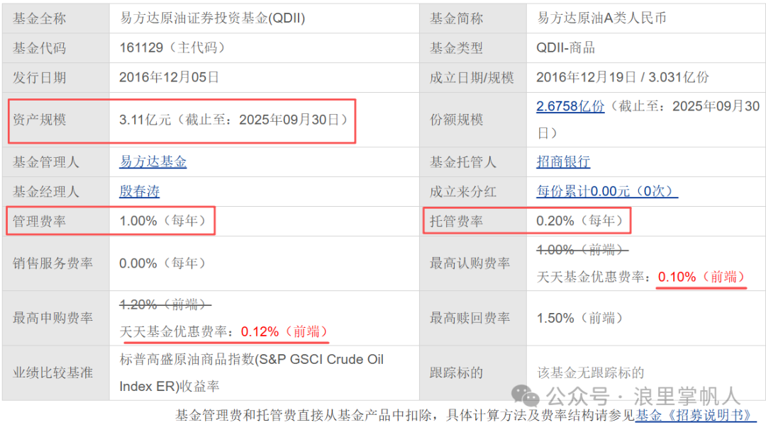 其次就是跟踪原油期货价格的基金产品,比如易方达原油LOF(161129)、南方原油(501018)和嘉实原油(160723),这几个场内基金产品的盘子都太小,成交极不活跃;而场外基金的管理费也挺高的。