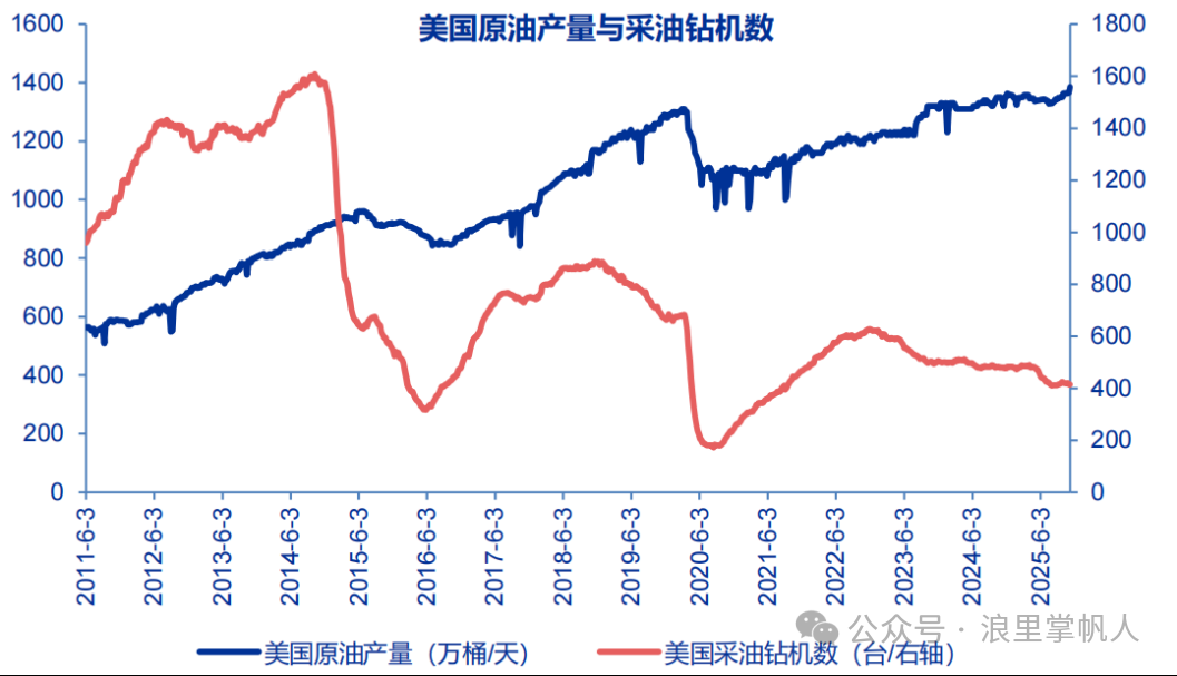 截至2025年11月21日当周,美国原油产量继续创新高。关注指标主要是每周发布的美国原油产量和活跃钻机数,一般活跃钻机数领先产量1-2个月,即钻机数增加,未来产量会上升。