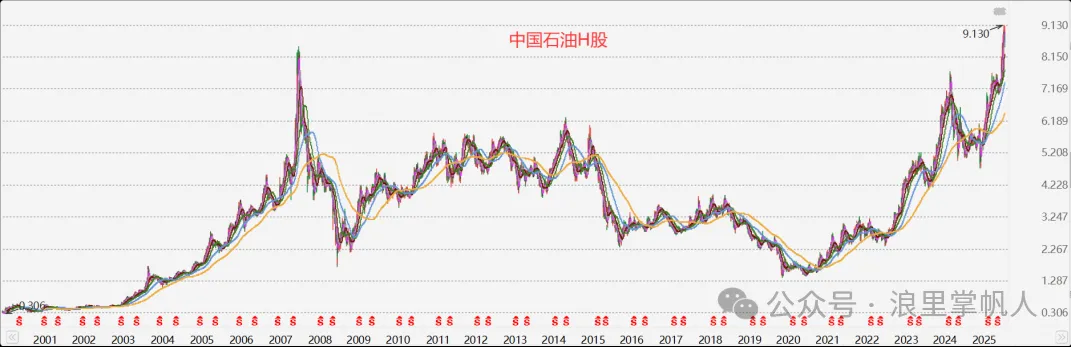中国石化:主要是以石油炼化为主,2025上半年其勘探收入占比只有10.3%,他的工作重点在于降本增效,推动炼化转型升级。利润大致与油价成反向关系,目前也是分红回报大幅提高(A股上市以来累计分红6276亿,但融资只有467亿),A股股息率3.92%,H股股息率5.69%,H股股价也是新高。