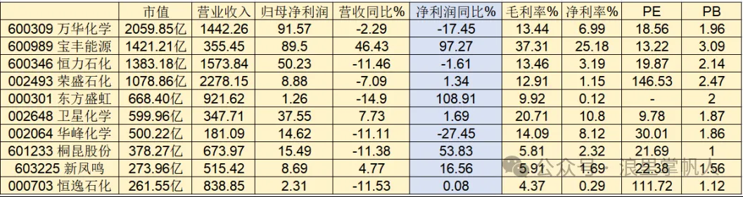 下图是一些代表性的化工板块的上市公司,从收入看,同比下跌的数量更多,利润增速表现不一。