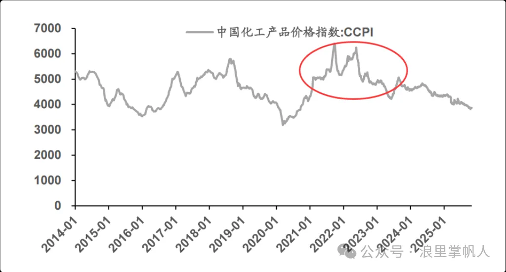 对于其他化工来说,CCPI指数持续下跌(下图),利润难言好转。2025年三季报的在建工程同比增速有所回落(在图中画圈的地方开始猛上项目),但绝对规模仍维持在相对高位,也就是说未来供给增量还很大,除非需求爆发式增长消化供应增量(有难度),或者等供给侧自动出清(淘汰落后产能、淘汰成本高的,政策推动供给侧改革),这个过程就很缓慢,就导致整个化工行业的投资回报率还将随着产能的投放而下滑。