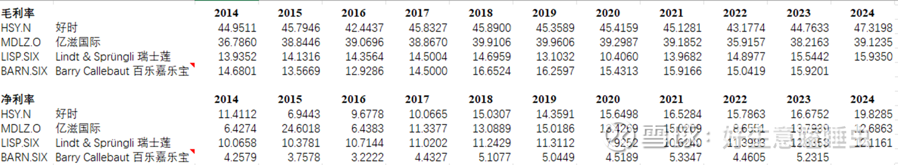 毛利率及净利率的对比看,好时的盈利能力优于同行
