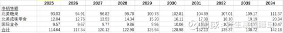 不考虑大幅扩展动作,且国际业务和咸味零食的历史利润贡献不大。参考历史增速, 预估营业利润率未来十年为10.11%。