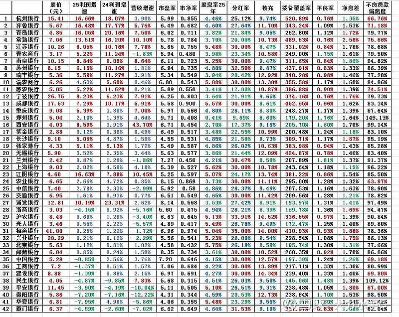最新42家银行股全家福来了,有需要的可以保存下。(这次新增了不良贷款偏离度这个指标,红色代表优秀,蓝色一般,绿色较差)