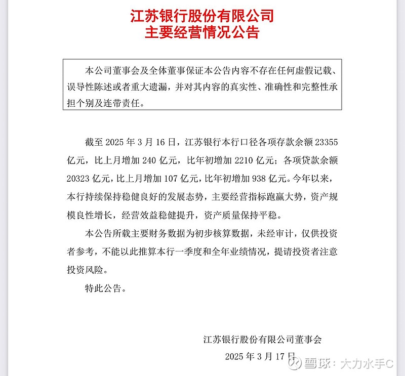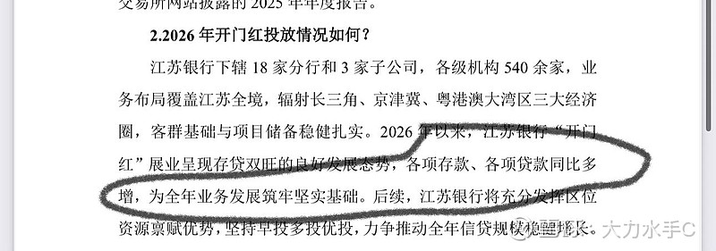 2026开门红投放情况:管理层说2026年来江苏银行存贷款同比多增。我特意查了下江苏银行25年一季度存贷款情况,2025年3月18号江苏银行发布了经营情况:截止到3月16号,江苏银行存款比年初增2210亿元,贷款比年初增938亿元;2025年一季报显示:江苏银行银行存款比年初增13.8%,贷款增14.2%。再加上楼主从内部员工了解到,今年元旦三天增1000亿可以看出今年江苏银行存贷同比增速还是非常迅速。一季度全力新增存贷款已经是江苏银行老传统了。说明江苏银行存贷需求还是非常旺盛,争取做到早投放早收益。