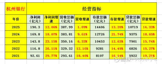 2025年净利润为190.3亿元,同比增12.06%,增速比起24年18.07%、23年23.15%、2022年26.11%,21年29.77%每年均下滑一点,主要原因是这几年银行规模扩张,息差收窄,25年债券市场低迷,不良冒头,经营变得没以前那么优秀,但是杭州银行目前12.06%利润增速依然可以排在42家银行第三,仅次于青岛银行和齐鲁银行。