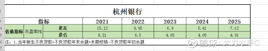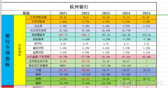 接下来我们看看杭州银行21-25年的风险指标中的不良贷款余额、不良率、拨备覆盖率、偏离度、计提信用减值损失、核销、当年新增不良等指标。