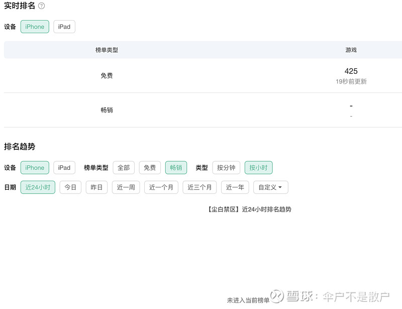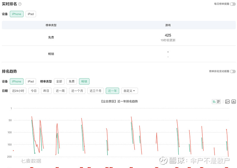 $创梦天地(01119)$ 尘白禁区基本是可以作为卡拉彼丘对标的游戏。去七麦第一眼进去时看到排名只会觉得这游戏凉了,再一看是网易的,于是好奇看了下收入,发现其实还不错。这种模式和卡拉彼丘的未来很像,即平时无氪金,完全靠每一个新赛季收钱。