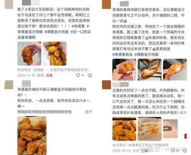 薄脆金沙鸡翅2025年10月首次作为限量产品上市,11月短暂返场,2026年2月便进入长线菜单,如此快的速度源于消费者的热烈反馈。薄脆金沙鸡翅一上市就响应火爆,许多人连跑四家门店,或专门去到偏远商圈的肯德基门店,只为了吃到这口翅。社交网络上,消费者们乐此不疲地分享关于薄脆金沙鸡翅的口感:“连吃多个不会腻”,“咸甜口带蒜香,吃起来很满足”。更多消费者对肯德基喊话“不要下架”、“长期售卖”。