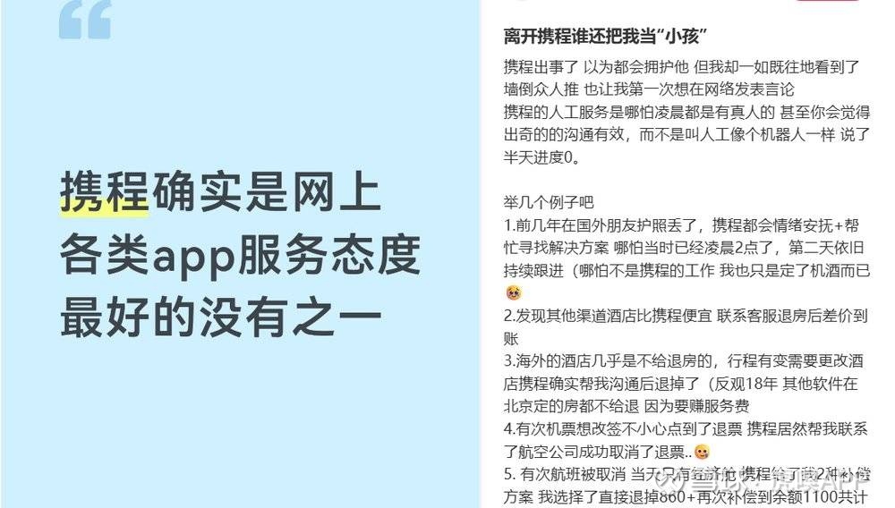 越来越多曾被“捞”过的人主动发声。“用过携程的人会觉得携程是一个不折不扣的天使”、“在国外,至少携程会管你”、“没了携程,谁凌晨4点会理我”。