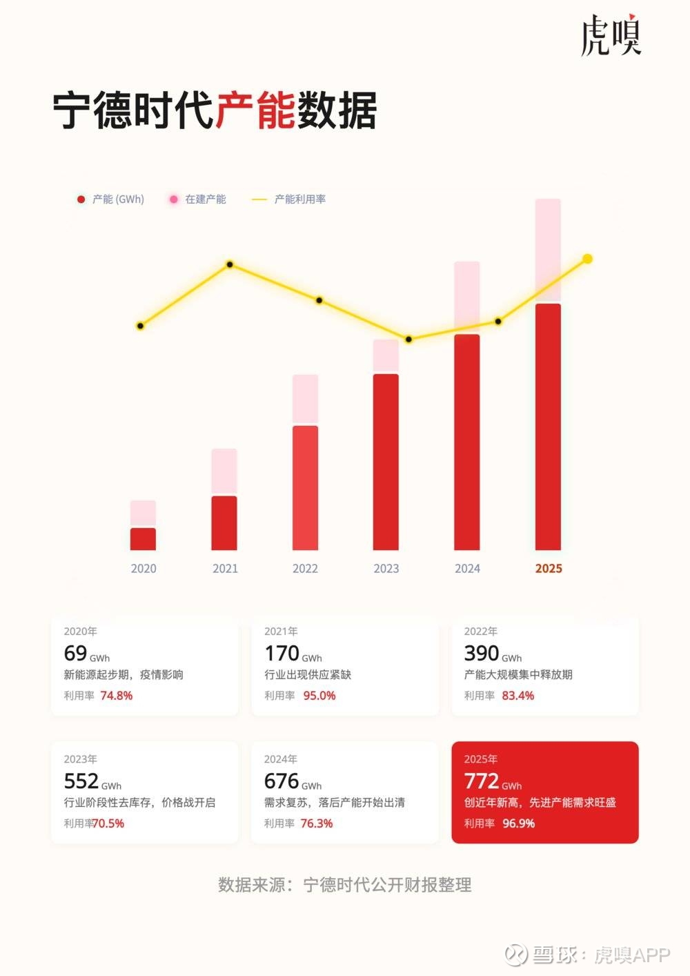 2021年,当全行业陷入“一芯难求”的疯狂时,宁德时代170GWh的产能,利用率是95.0%。四年后,它的产能规模已经膨胀到772GWh,规模增长了3.5倍,但利用率反而更高了。