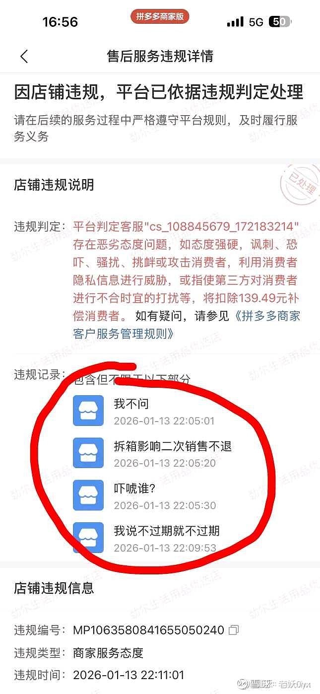 $拼多多(PDD)$ 今天看到雪球上有商家抱怨拼多多罚款多,从他的截图上看,这个商家确实离谱。这涉及另外一个问题,拼多多上不仅底层的买家多,底层的卖家也非常多,买家很多是菜市场里为了一块钱磨半个小时的大妈,卖家很多也是大集上恨不得坑一把就跑的小商小贩。如果按照五环内投资者的思路,应该是找来非常多的客服,对整个交易、售后过程进行客观的评判,然后给双方一个大致合理的裁决,但是这是行不通的,首先这群人本身就不怎么讲道理,很多人不占便宜就是吃亏,其次整个客服的成本会非常夸张,大妈小贩有的是时间跟你慢慢磨。拼多多选择了另外一条路,简单粗暴的罚商家,小错小罚,大错大罚,甚至无错也罚,这样消费者满意了,平台也不需要多少客服,消费者也有评分机制,避免太离谱的消费者把商家薅破产了。这里唯一受伤的是商家,但是商家也是会算账的,如果太离谱了不开了或者去别的平台开就好,用整体商家供给情况来对这个偏向客户的尺度进行调节,总体上是有效的。至于说淘宝为何不这样,我认为有两个原因,一、淘宝复杂的运营机制把这群小商小贩拦在门外了,他们在淘宝上生意根本做不起来;二、客观说淘宝客服是比较偏向商家的,一般都是消费者吃亏,商家的抱怨自然就少了。中国的下沉市场,很多东西都是游走在灰色地带的,人员素质也是良莠不齐,拼多多把这门生意做这么大这么好,必然是要用很多五环内投资者诟病的手段的,这也是很多人认为拼多多野蛮的原因。