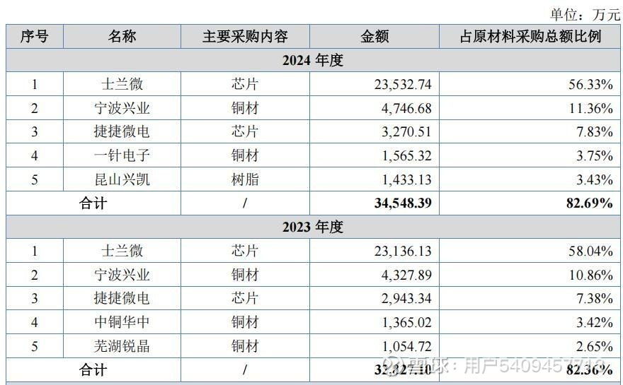 2022年-2024年,公司向前五名原材料供应商合计采购额占当期原材料采购总额的比例分别为85.85%、82.36%和82.69%,整体较为平稳。报告期内,公司向士兰微采购比例超过公司当年原材料采购总额的50%,公司主要向其采购芯片。士兰微作为全球领先的沟槽肖特基芯片生产商,是光伏二极管厂商的重要上游供应商,同时也是公司长期稳定合作的供应商。