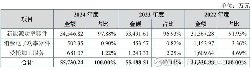 报告期内,公司产品主要应用于光伏行业,新能源功率器件销售收入分别为3.157亿元、5.349亿元和5.455亿元,占主营业务收入比例分别为91.95%、96.93%和97.88%,系公司主营业务收入的主要来源。