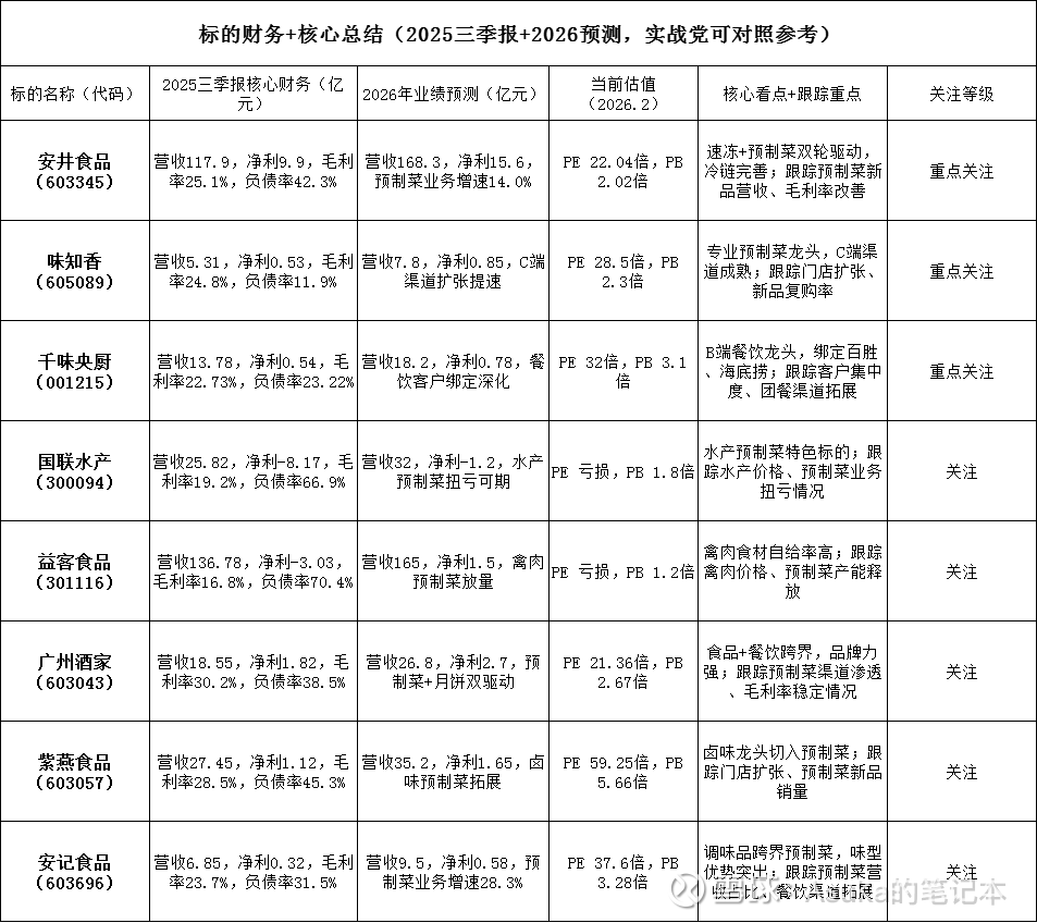 1. 跟踪节点(雪球人要的落地节奏,精准到细节):3月看标的年报(查业绩复苏情况,重点看预制菜业务营收占比)、4月盯预制菜国标征求意见截止时间+反馈结果(政策催化关键节点,大概率出板块利好)、6月看中报+机构持仓变化(判断资金动向,确认机构是否持续加仓)。